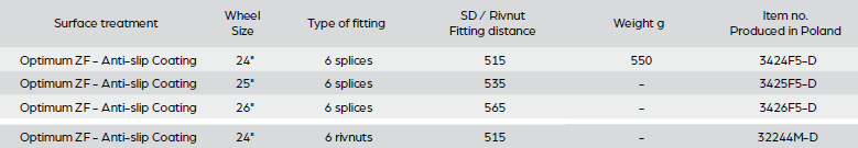- Fitting distance: 515 mm (24″), 523 mm (24″), 535 mm (25″), 565 mm (26″)