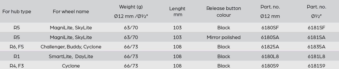 QR axles with aluminium push-button in black or mirror polished for hub types: R1, R4, R5, R6, F3, F5.
